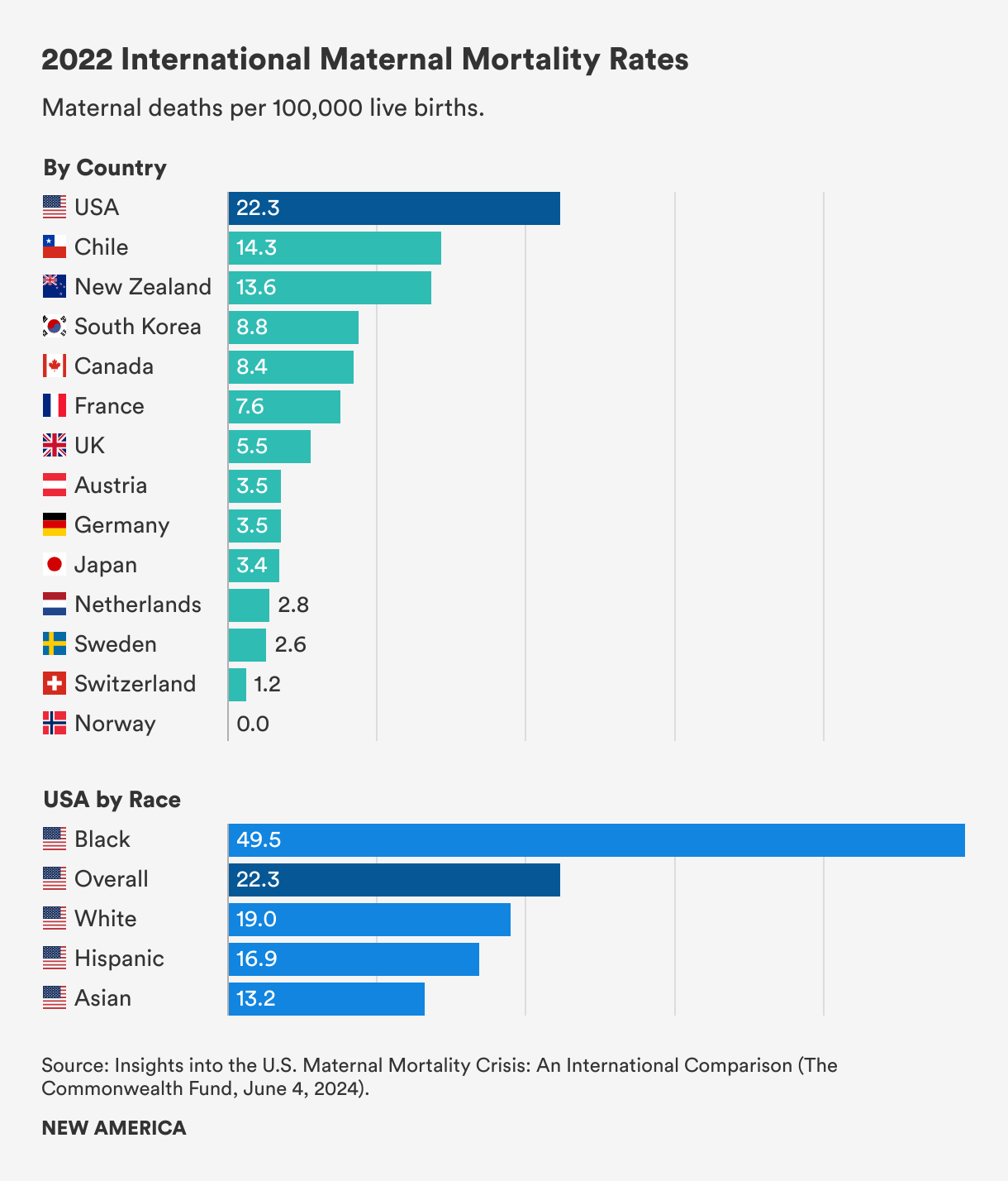 Comparing these numbers with those of other high-income countries illustrates how awful they are. New Zealand has a maternal mortality rate of 13.6 per 100,000 live births, and Sweden has a rate of just 2.6 per 100,000 live births, according to data from the Commonwealth Fund, a research foundation.